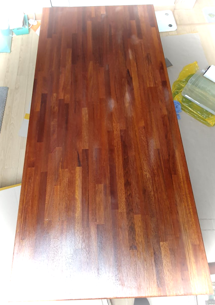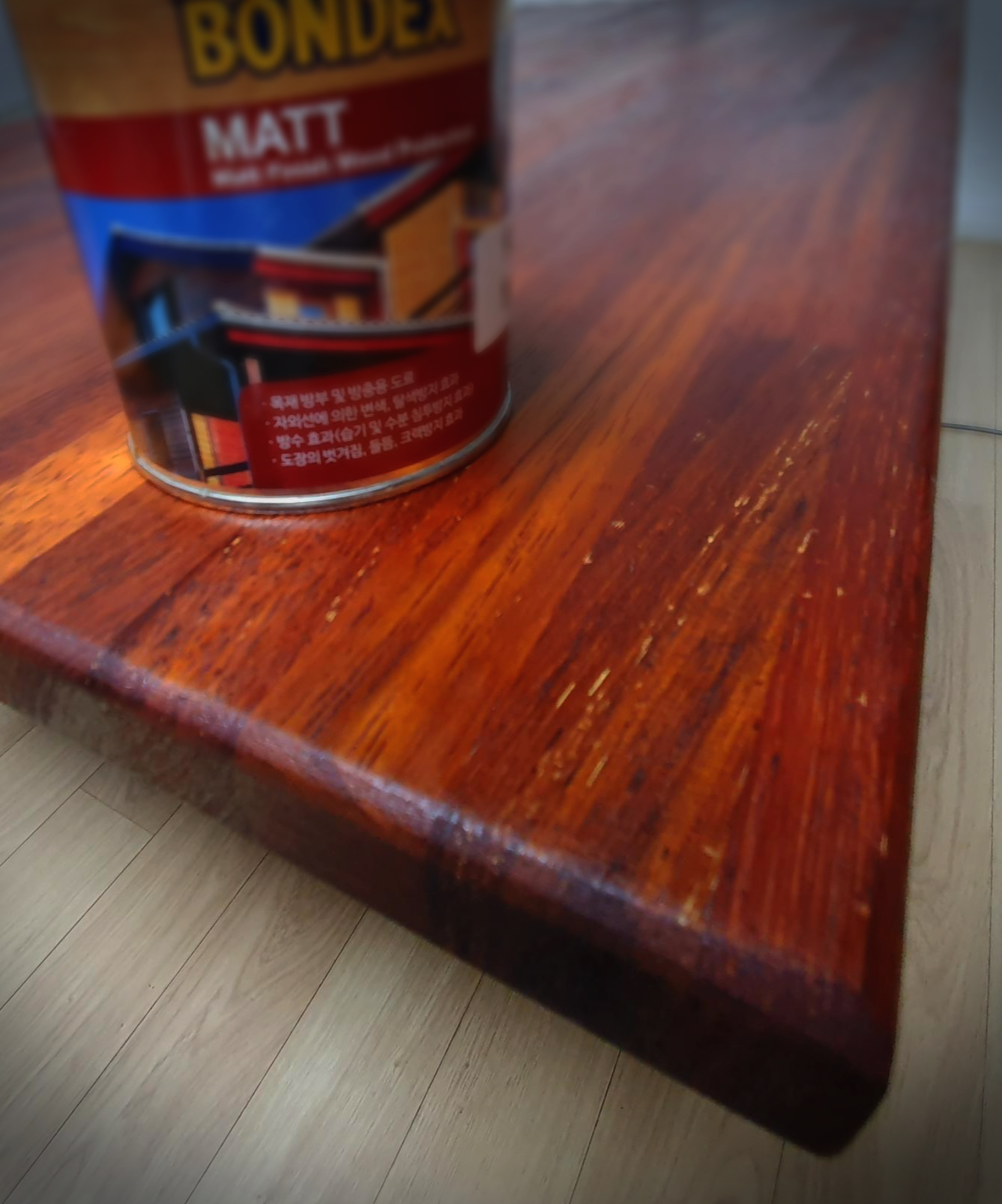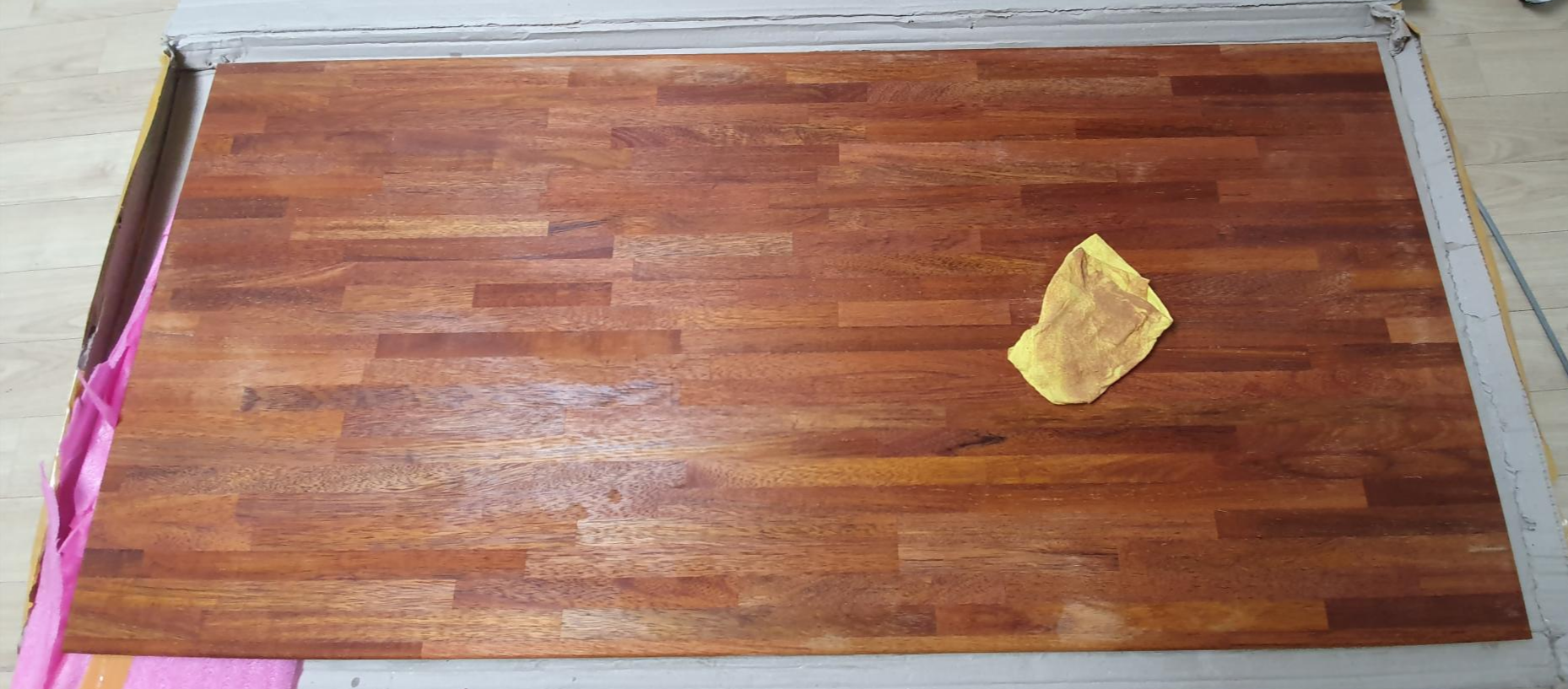 우선 멀바우 집성목 상판의 거친 표면을 부드럽게 하기 위해 샌딩 작업을 해야 합니다.