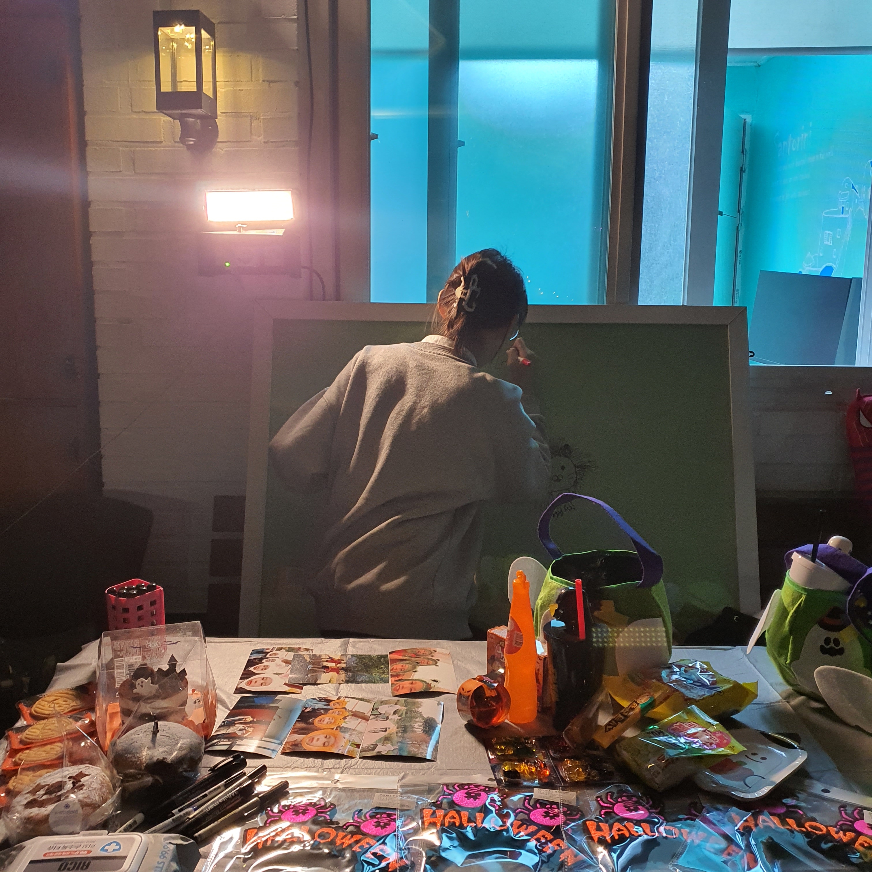 중2인 언니는 동생들을 위해 직접 보드에 HAPPY Halloween 작품을 디자인합니다.