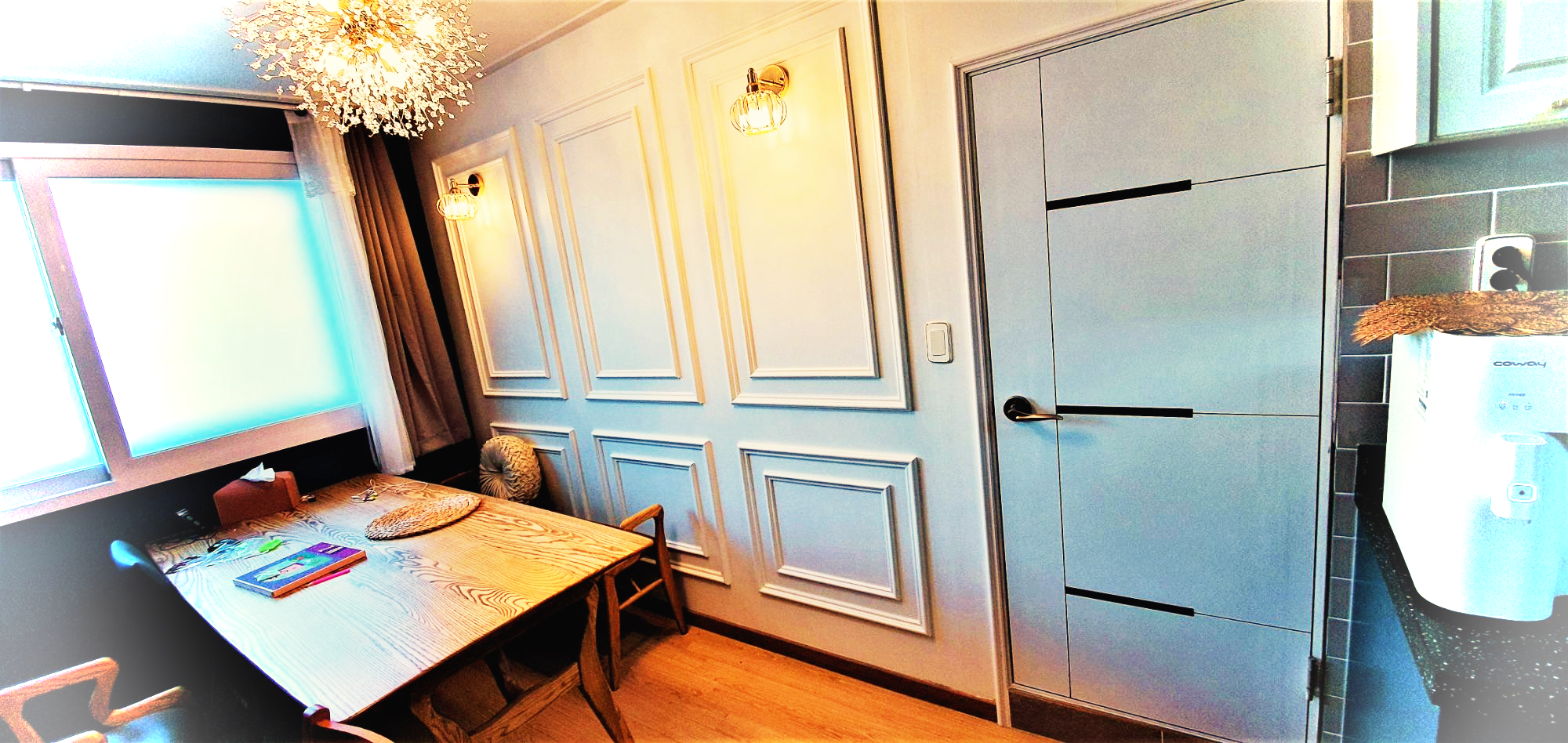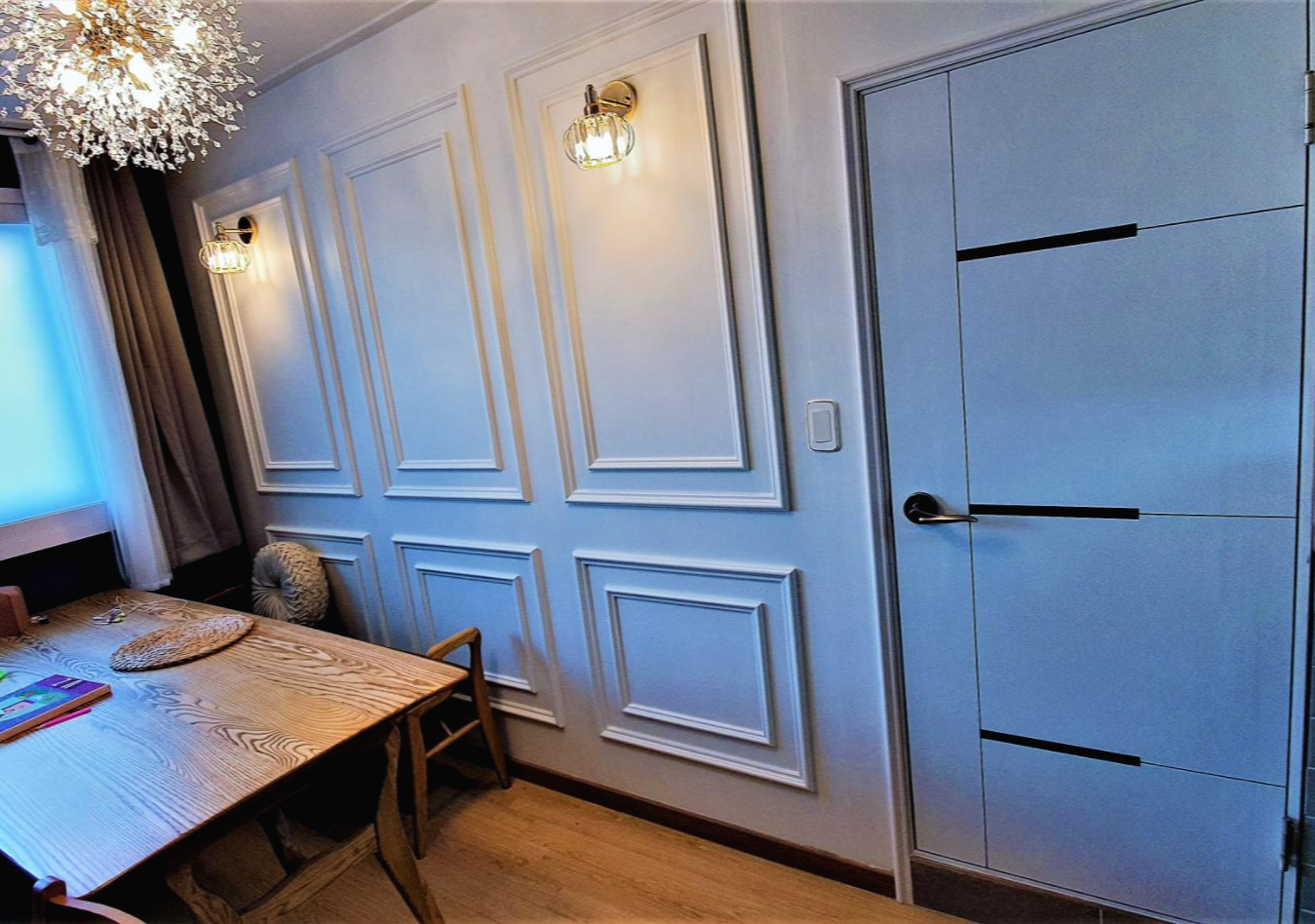 다이닝룸 도어의 웨인스코팅 셀프 시공 후 모습입니다.