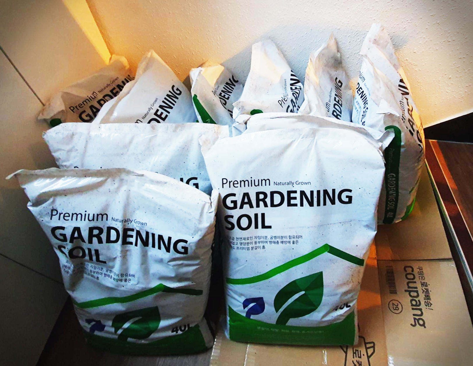화단의 크기가 크기 때문에 40L 짜리 흙 10포대를 준비했습니다.