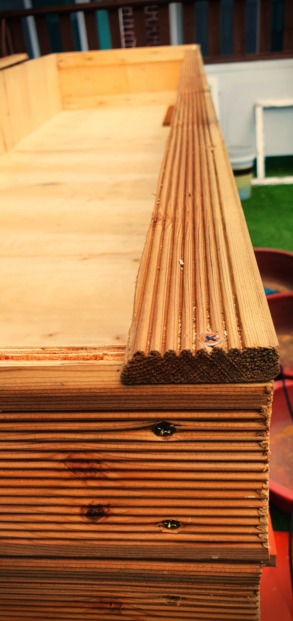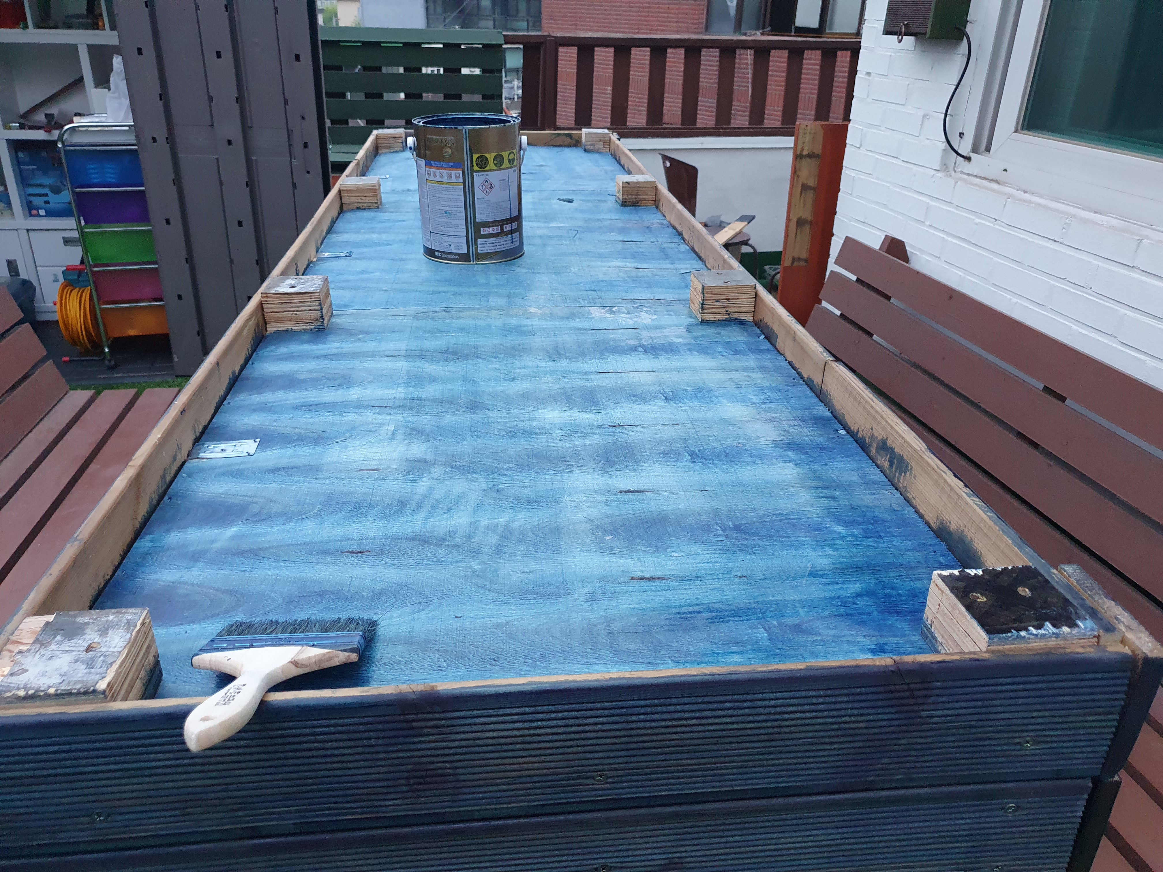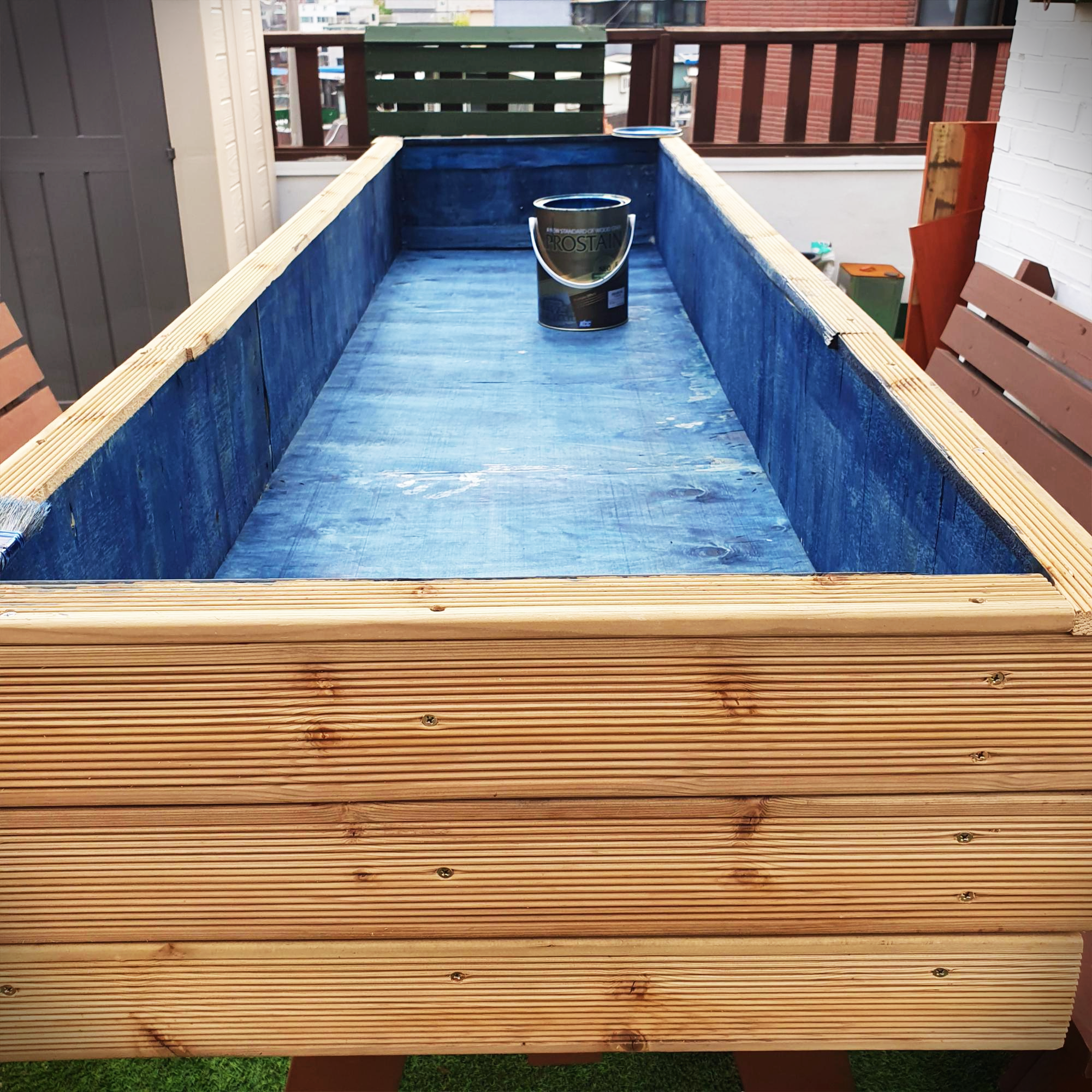 플랜트 화분 상부에도 합판의 모서리 부분으 덮어줄 방부목 데크재를 장착해 줍니다.
