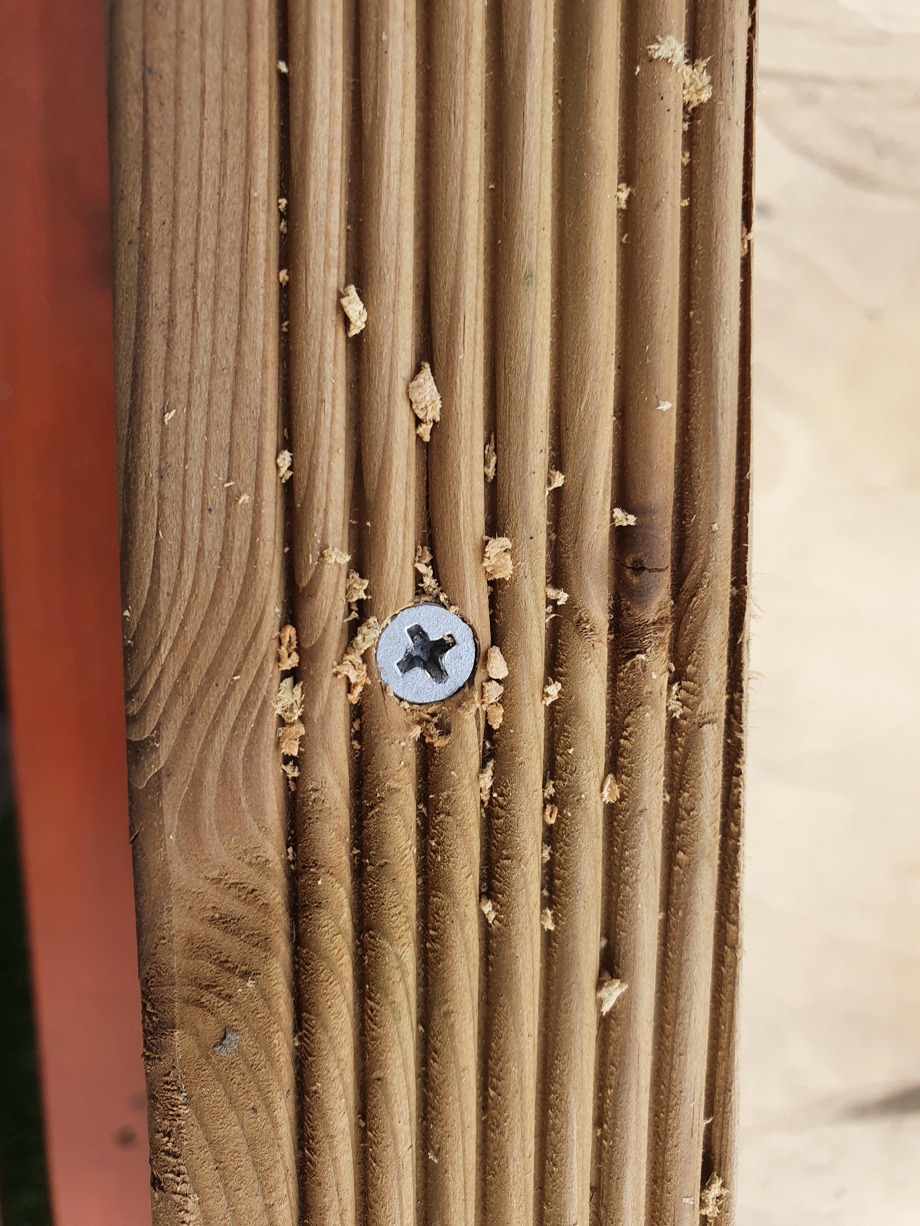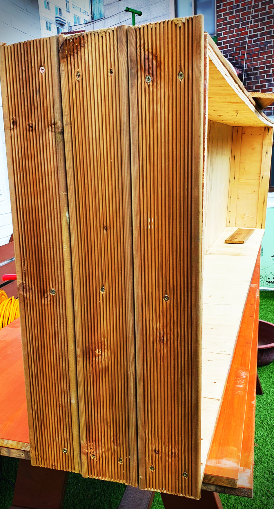 측면에도 재단한 치수대로 데크재를 커팅한 후 피스로 부착하였습니다.