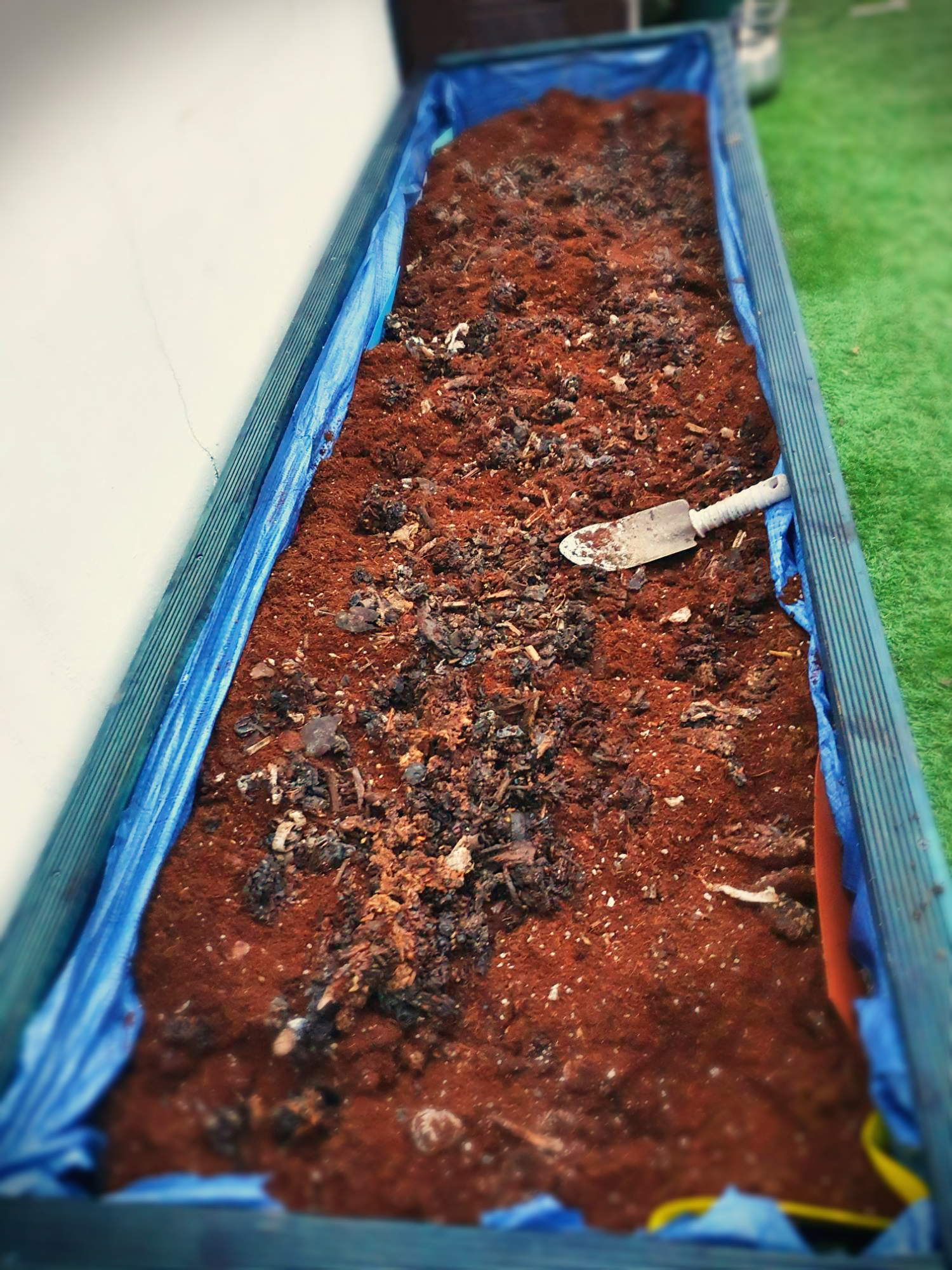 토양층 중간에 거름으로 한약재 찌꺼기를 중간에 뿌려 주어 토양을 비옥하게~