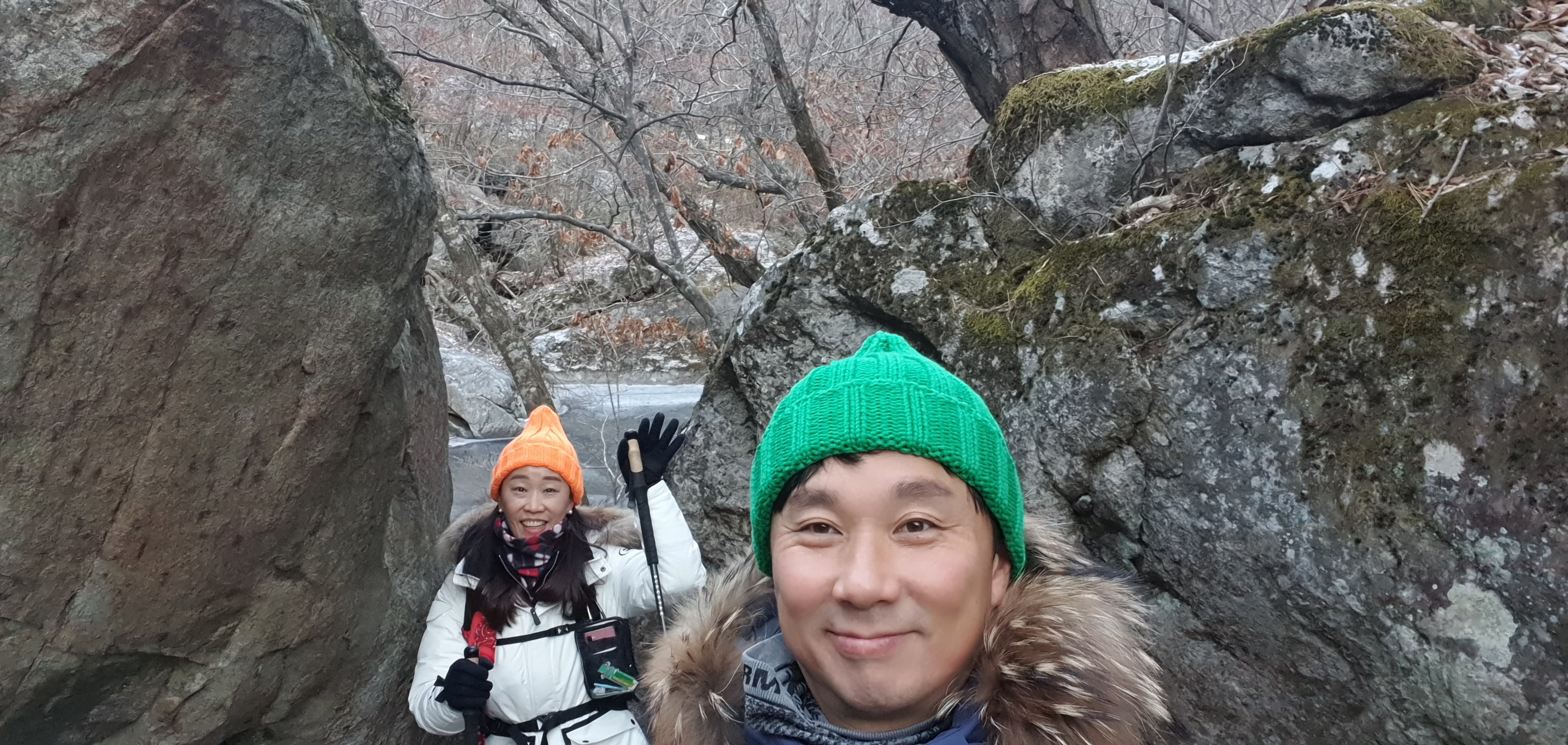 구천동 어사길을 통과해야 했는데 경사가 높지 않은 트레킹 코스로 지난 휴가 때는 미쳐 올라와보지 못했는데 겨울이라 계곡물이 꽁꽁 얼었음에도 불구하고 주변의 숲과 어우러져 멋진 경치를 자랑한다.