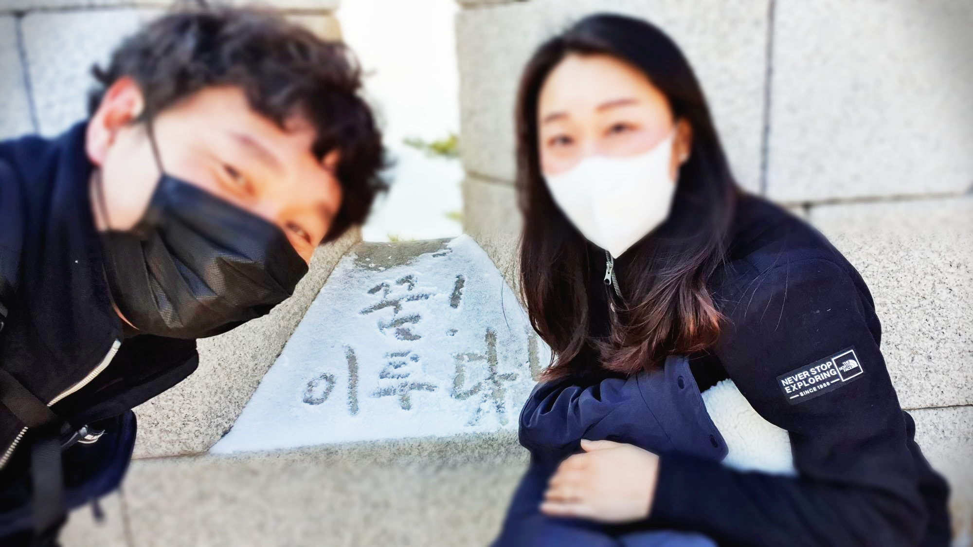 인왕산 정상 근처 성벽 사이 공간에 누군가가 우리 생각을 대신 눈 위에 새겨 놓았다.