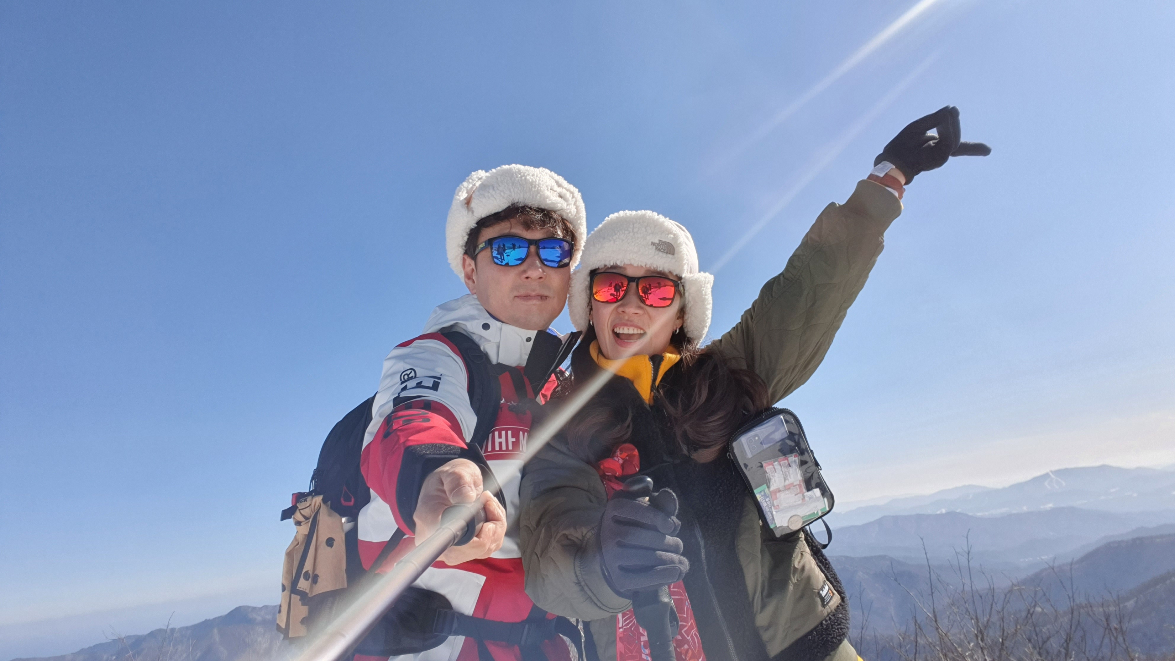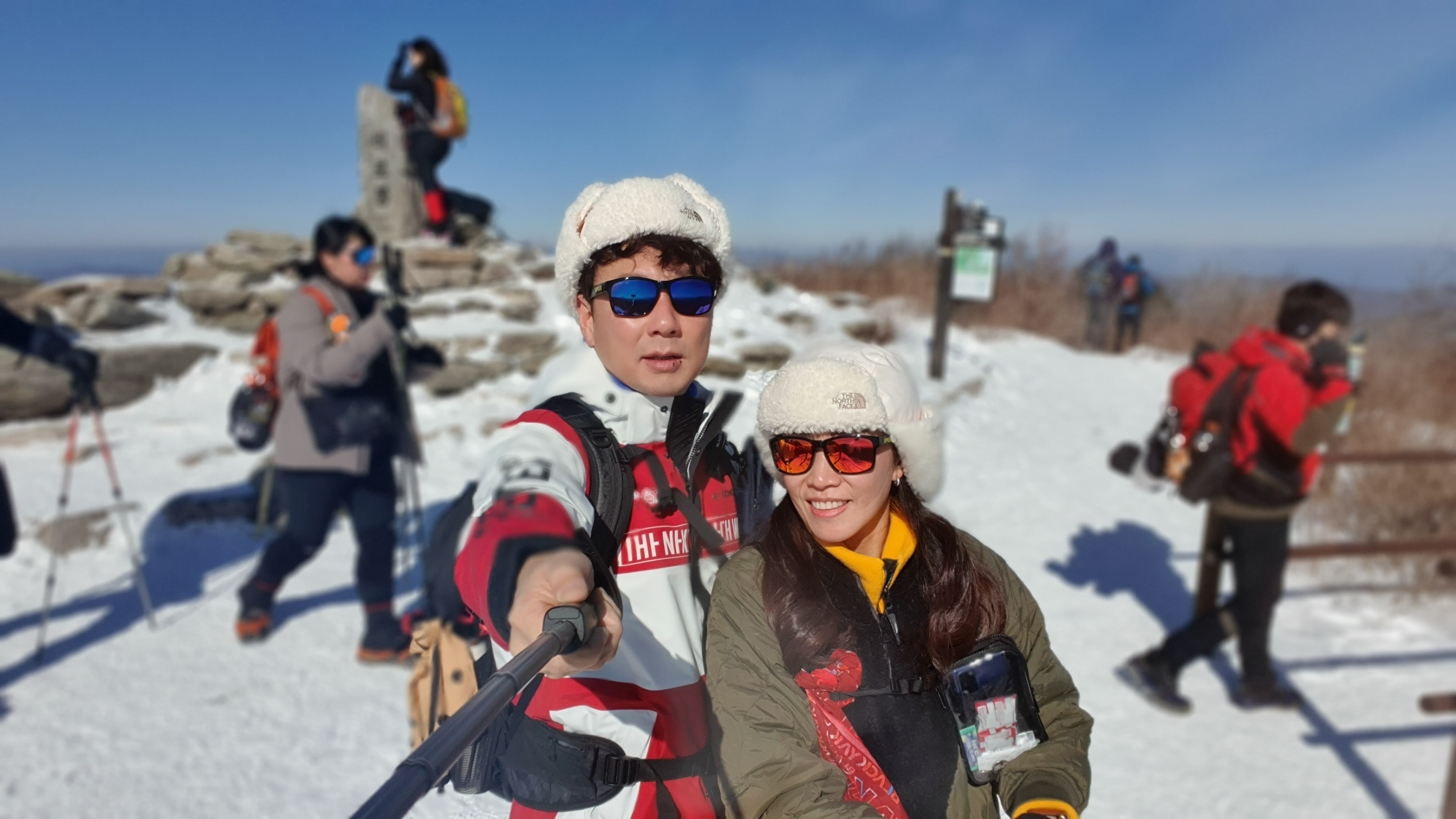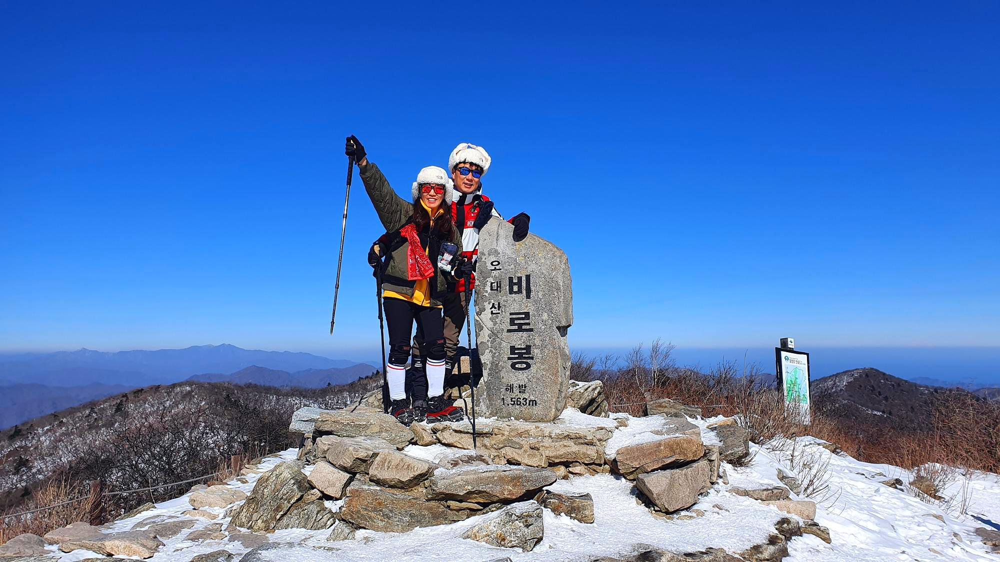 오대산 정상 비로봉에서 셀카 놀이에 바쁜 40대 중반 등산 12주 차 부부