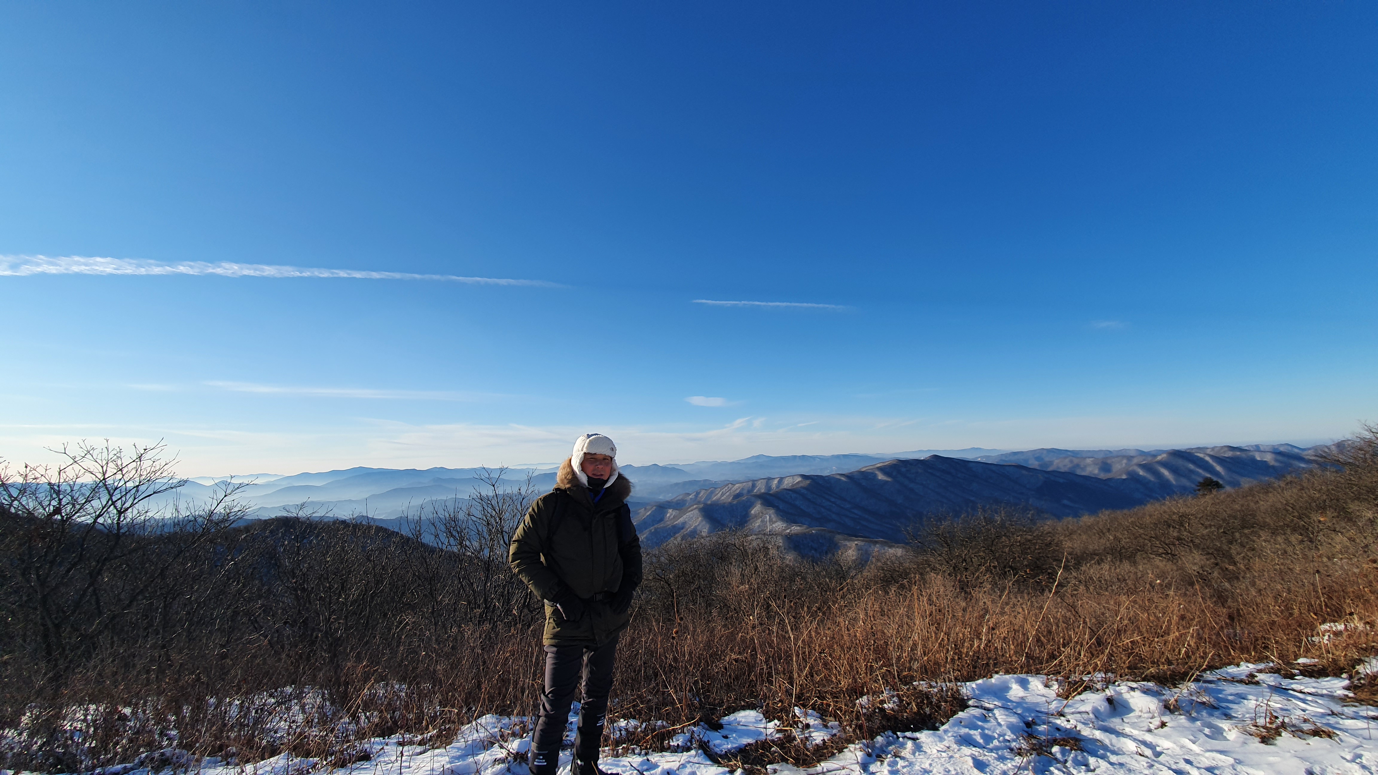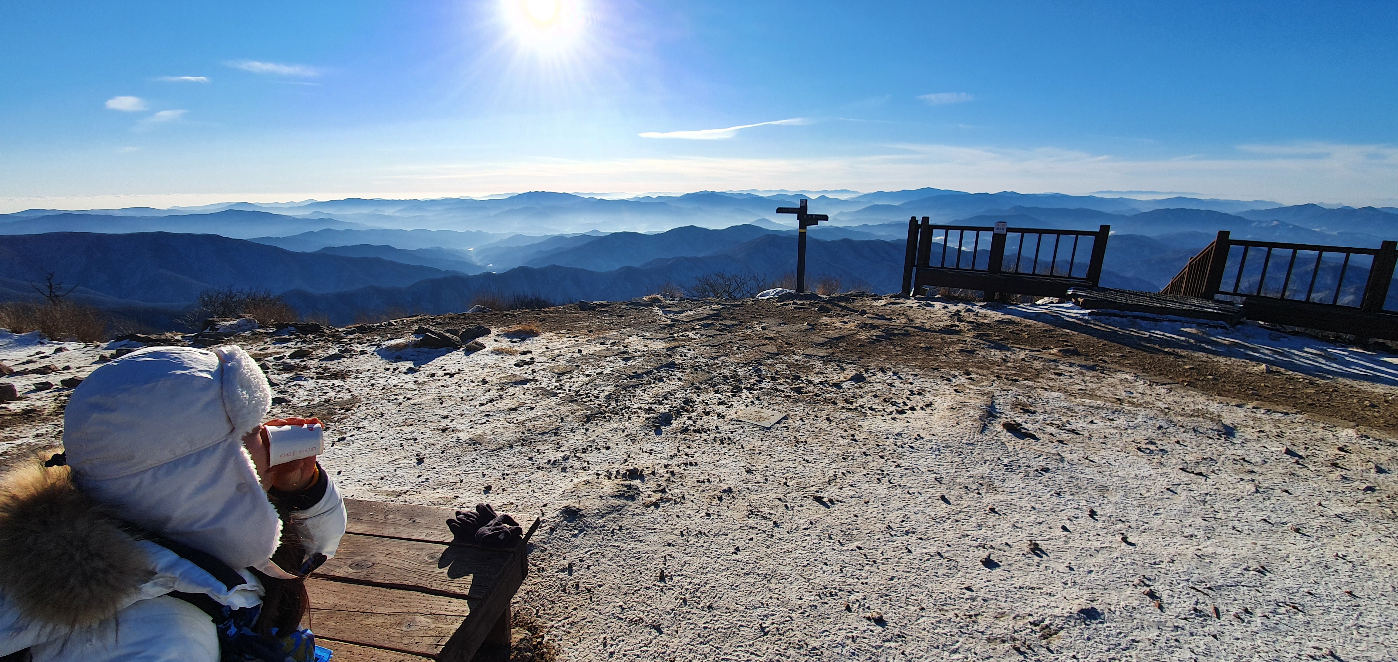 처음 정상에 올라왔을 때는 우리와 앞서거니 뒤서거니 하셨던 마음씨 좋은 부부 한 커플뿐이셨고 마침 정상에서 다시 만나니 사진도 서로 찍어 드리고 특히 보온병에서 따뜻한 믹스 커피 한잔씩도 타 주셨다.