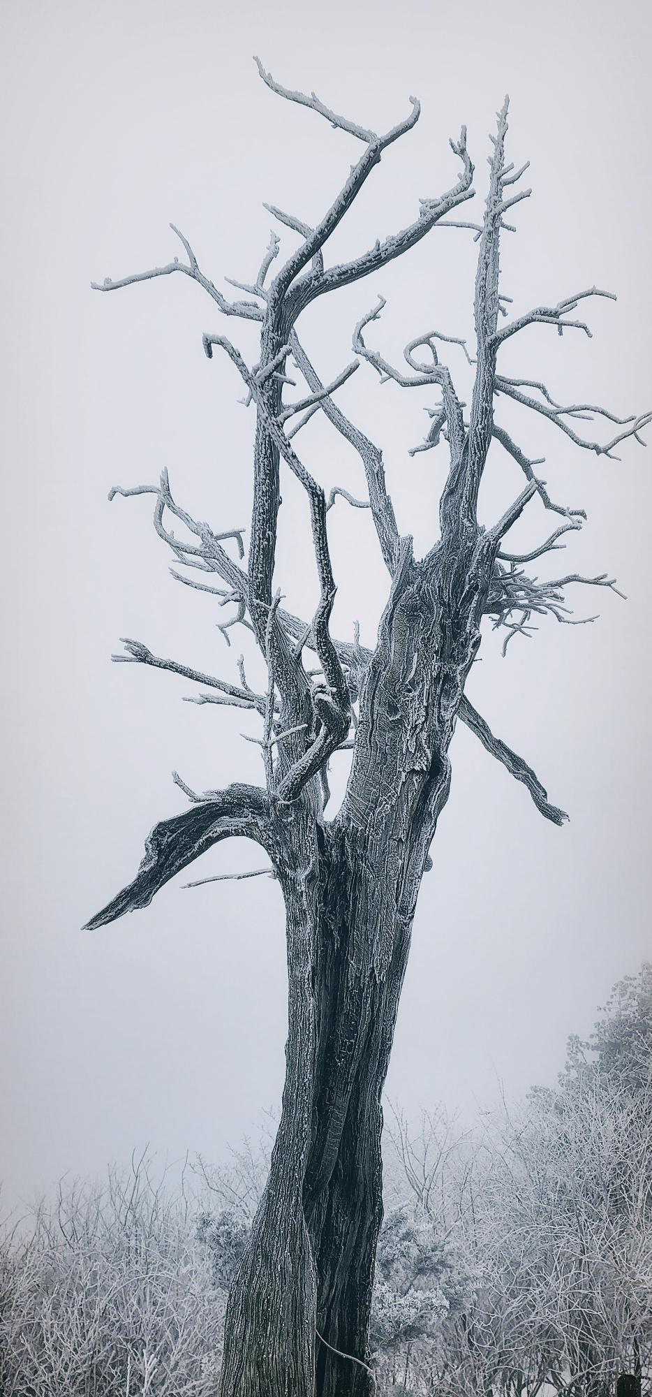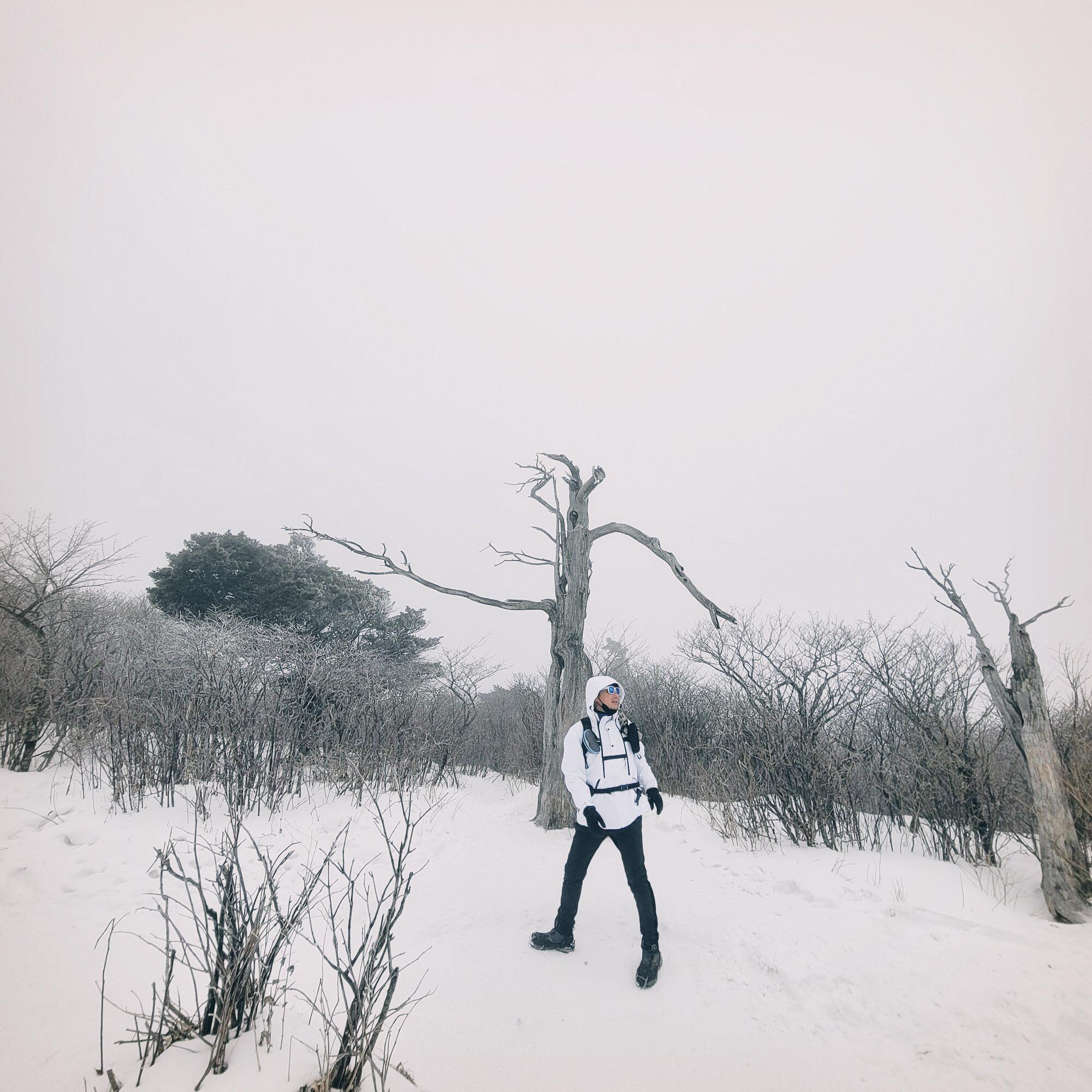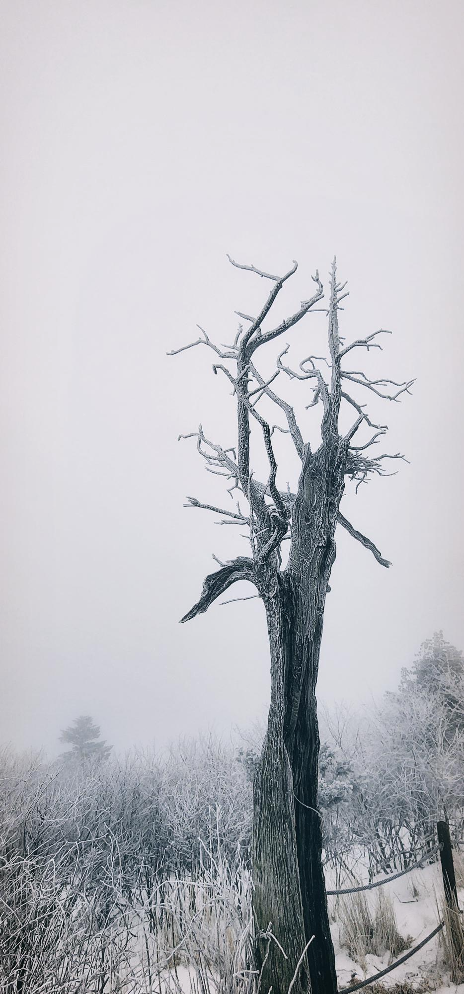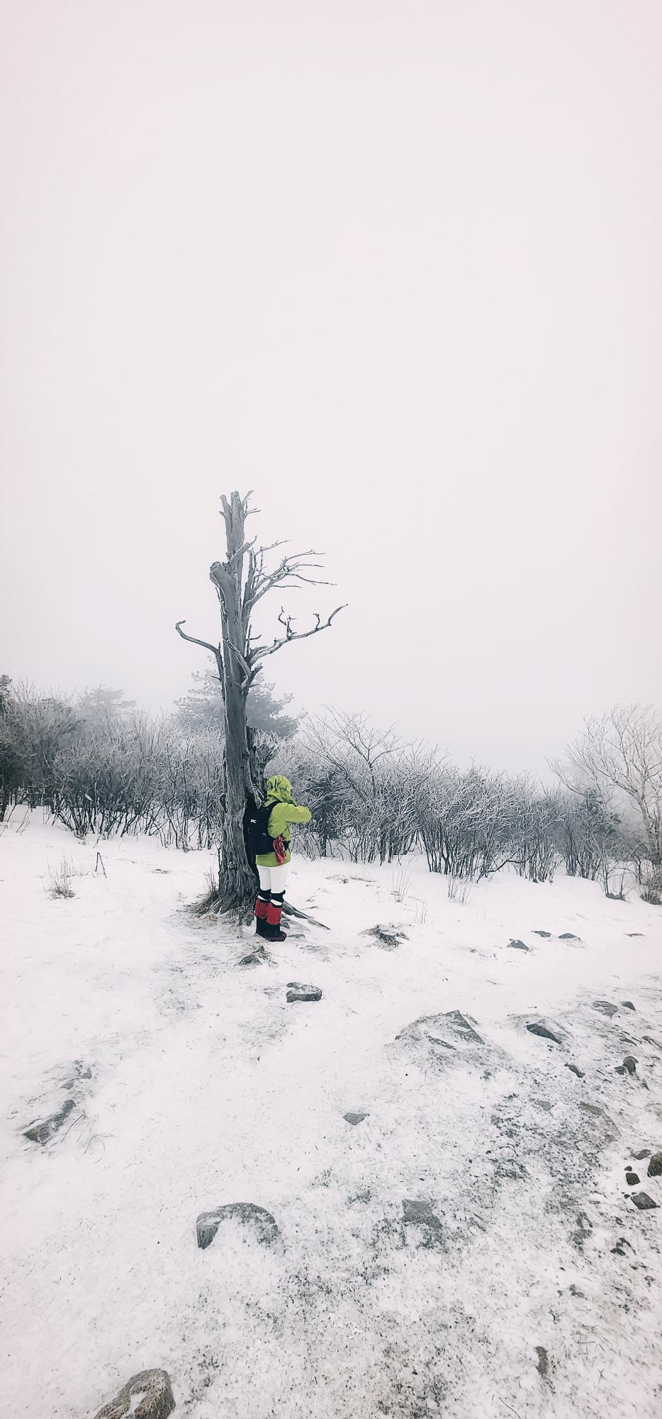눈 꽃핀 고사목과 한 몸이 된 여인