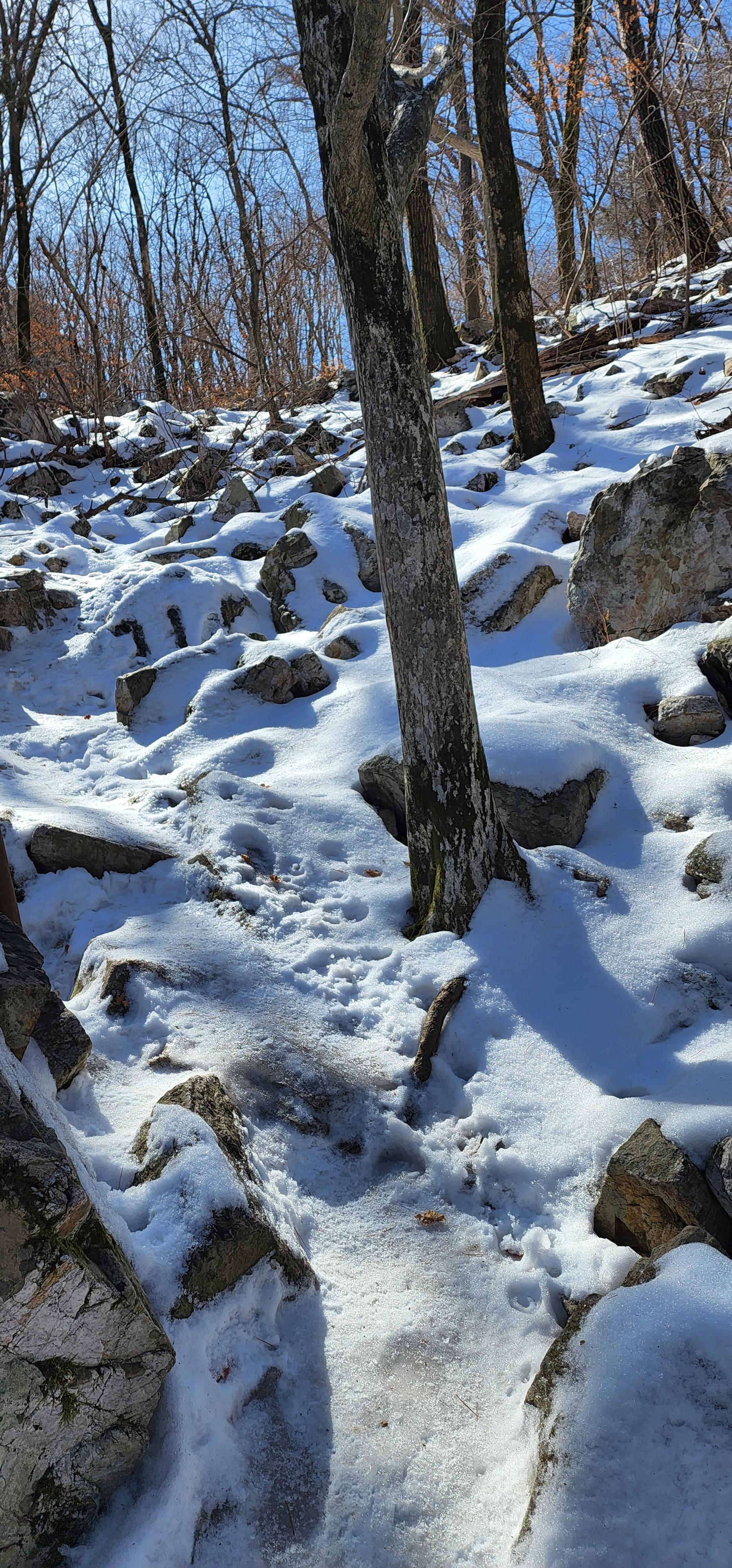 처음에는 얼마 안 가면 녹은 길이 나오겠거니 하고 아이젠 착용을 미루었는데 눈길이 아니라 아예 얼음 덮인 경사구간이 시작되더라~