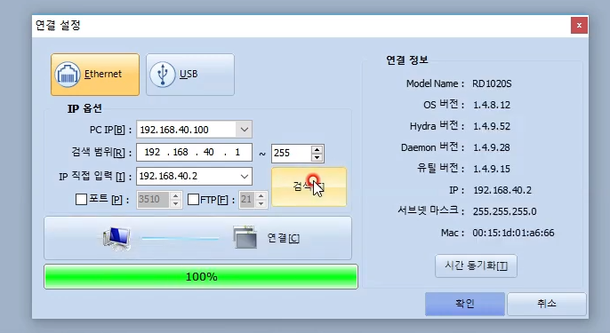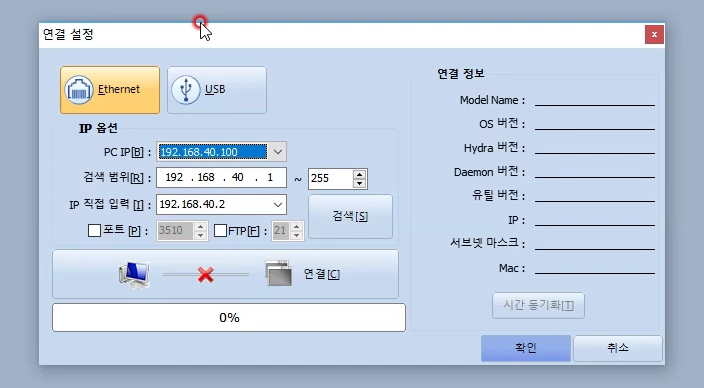이더넷(Ethernet) 버튼을 선택한 후 PC에 IP를 설정합니다.