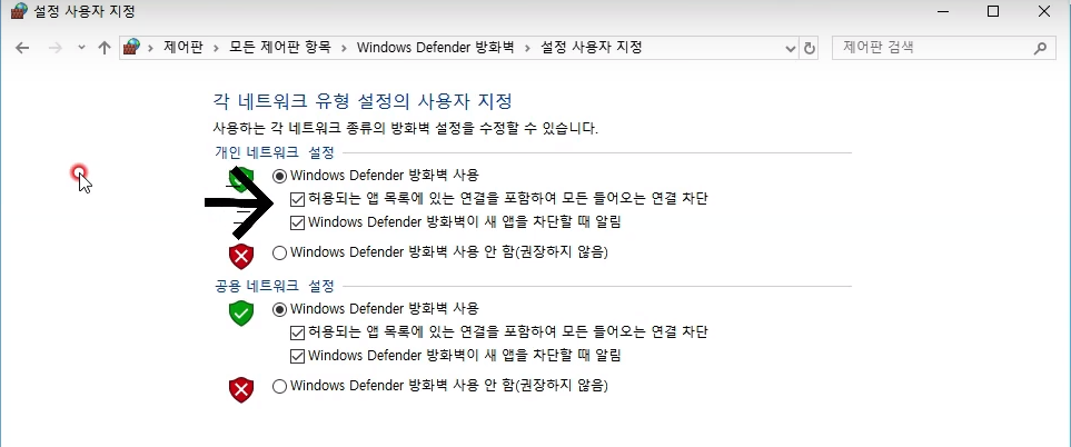 모든 들어오는 연결차단 항목에 체크를 제거해 줍니다.