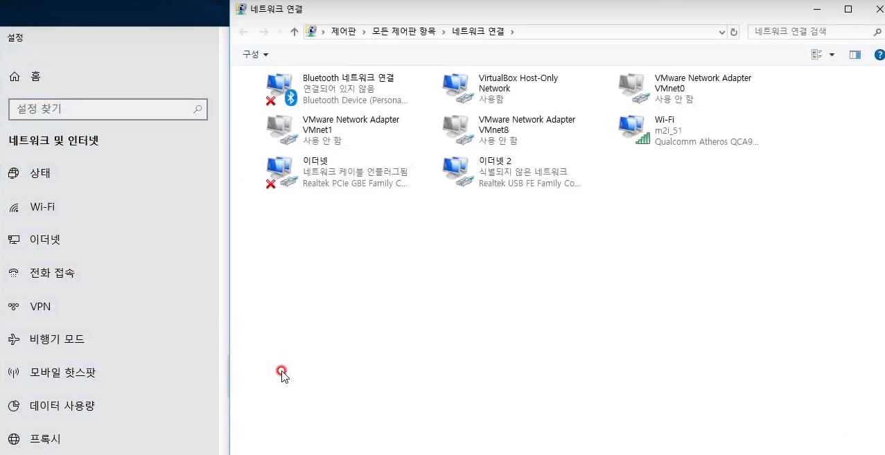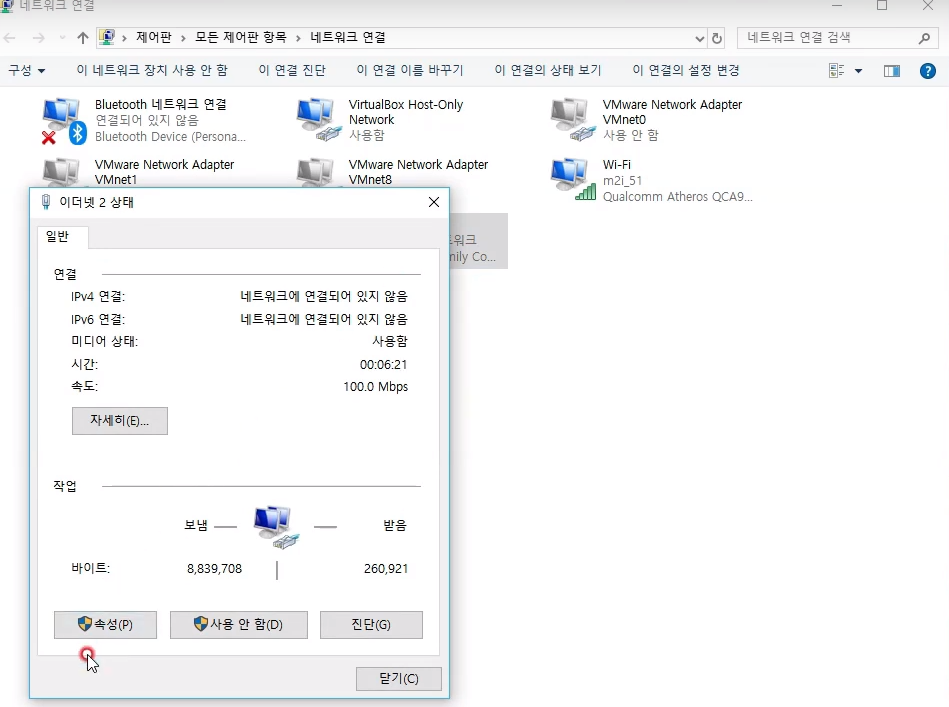 세번째 팝업된 창에서 어댑터 옵션 변경 클릭 후 네트워크 속성 열기.