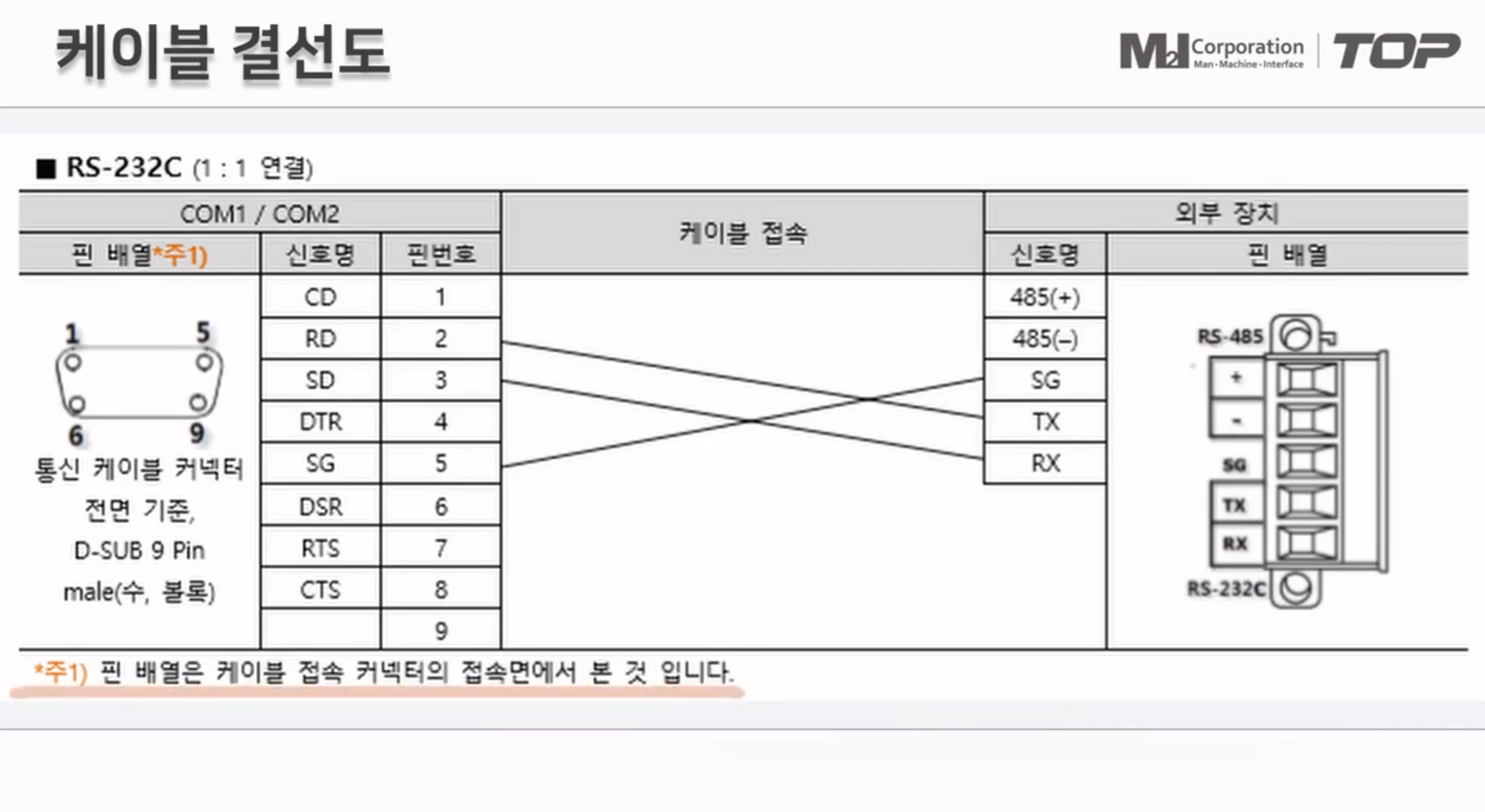 엠투아이 TOP 터치 패널과 LS PLC XGB 간에 통신 케이블 연결도