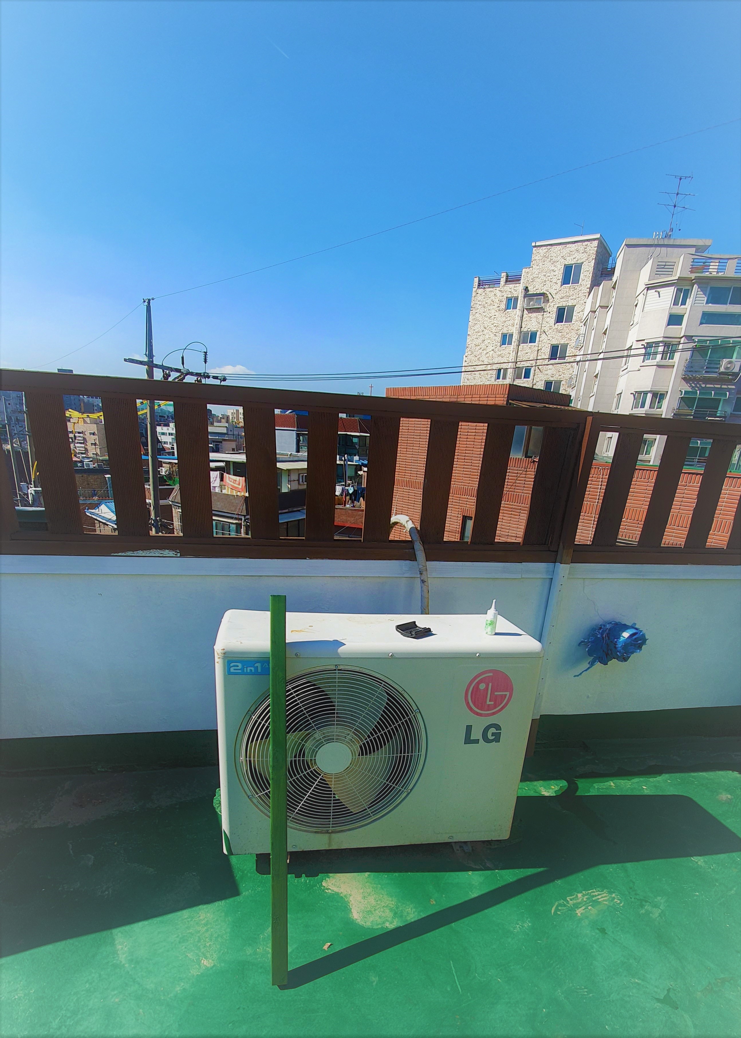 에어컨 실외기 오른쪽에 파란 비닐로 쌓인 배수구 같이 생긴 배관도 흉물스럽기는 마찬가지..