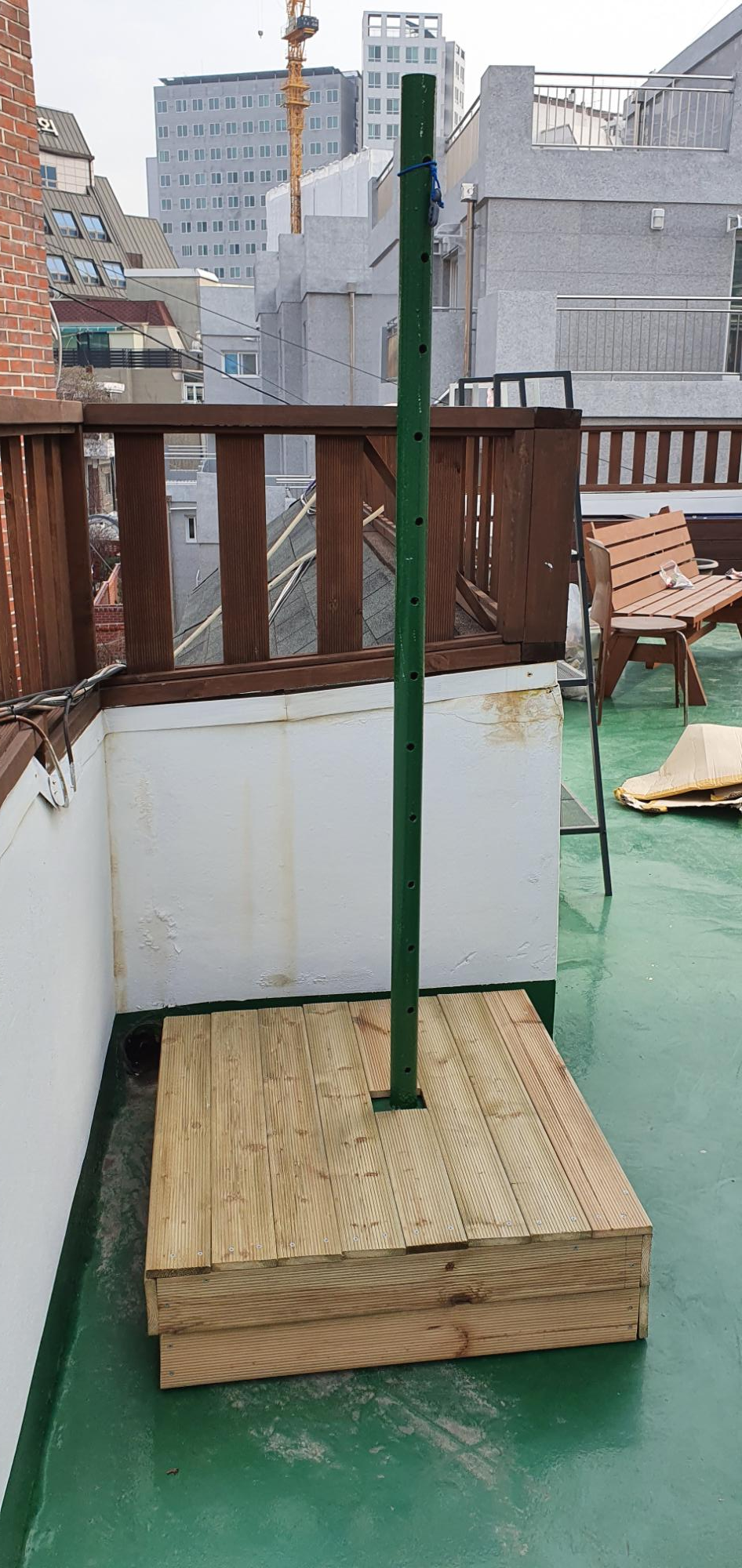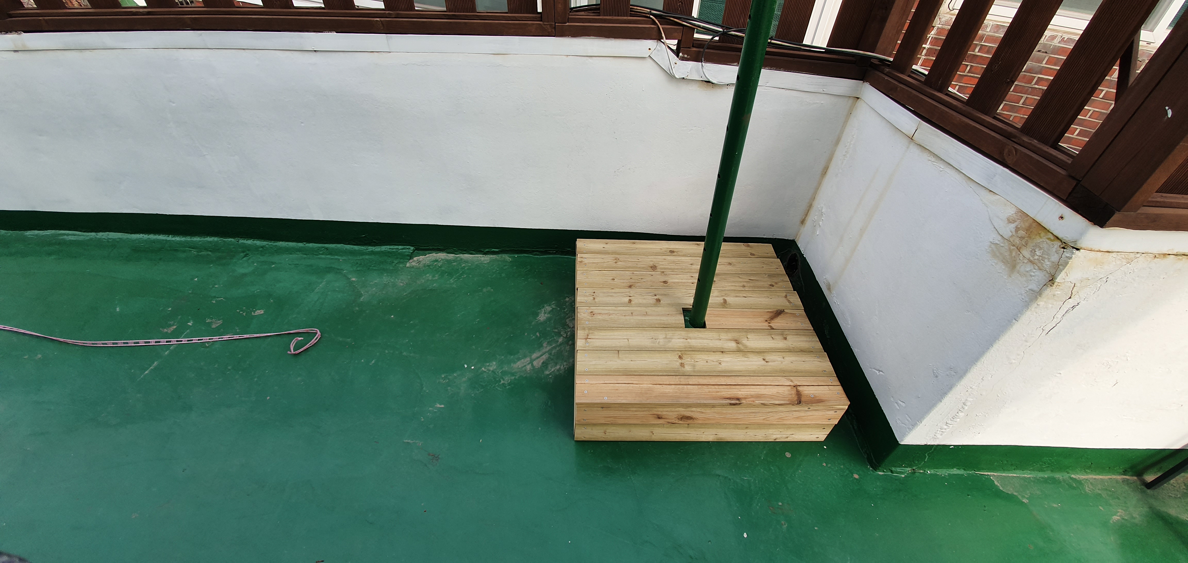 왼쪽에 있는 옥상 휀스 지지대를 이용하여 고정시켜 주었습니다.